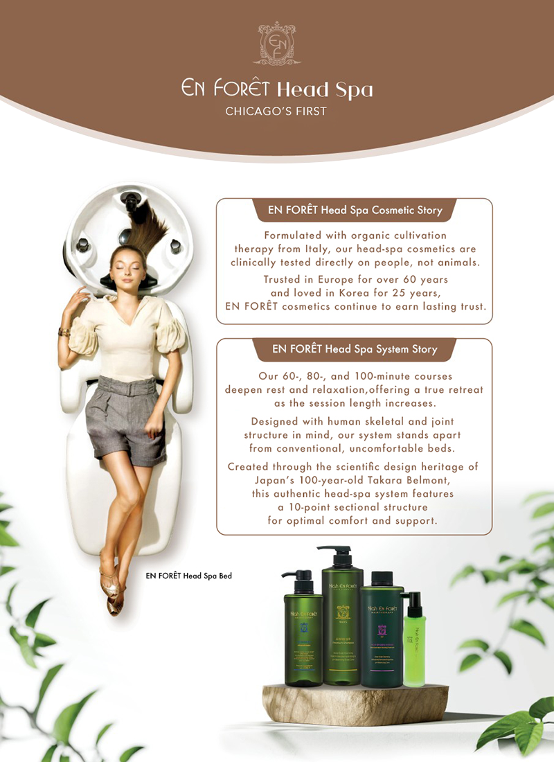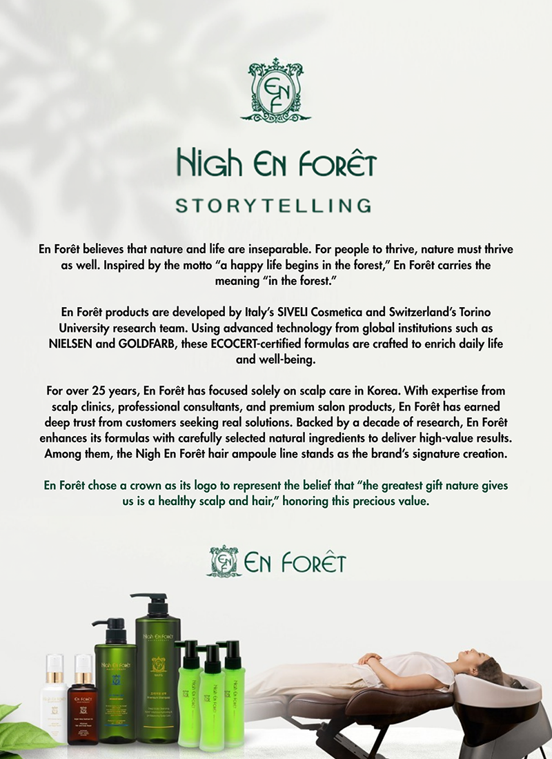High EN FORÊT is founded on the belief that nature and human life are inseparable. We believe that a life aligned with nature is a truly fulfilling life, and our name carries the meaning of “in the forest” to reflect this philosophy. The scalp and hair are precious gifts given by nature, and our brand honors this by elevating the symbol of the CROWN. The crown in our logo represents the highest value placed on a person’s well being, a healthy scalp, and naturally beautiful hair. High EN FORÊT is committed to delivering comfort, balance, and a deep sense of restoration through every care experience.