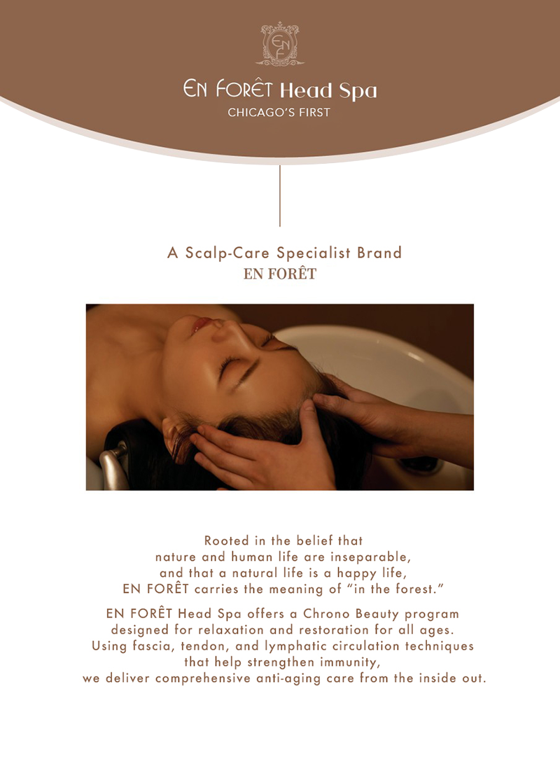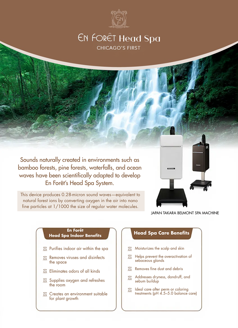 A restorative head spa experience inspired by the calm of the forest. Enjoy deeply relaxing programs ranging from 40 to 100 minutes, featuring organic Italian scalp formulations and Japan’s Takara Belmont ten point system. Each session combines fascia release, lymphatic flow, and circulation techniques to soothe tension, renew scalp health, and support your overall sense of well-being.